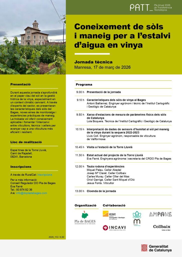 El proper dimarts 17 de març, de 9 a 13 h, la Torre Lluvià acollirà la jornada tècnica “Sòls i aigua”, una trobada imprescindible per a viticultors, tècnics i cellers del Bages. L’objectiu principal és aprofundir en el paper clau del sòl en la gestió hídrica de la vinya, especialment en un context de canvi climàtic, i compartir coneixements pràctics que es puguin aplicar directament al camp.