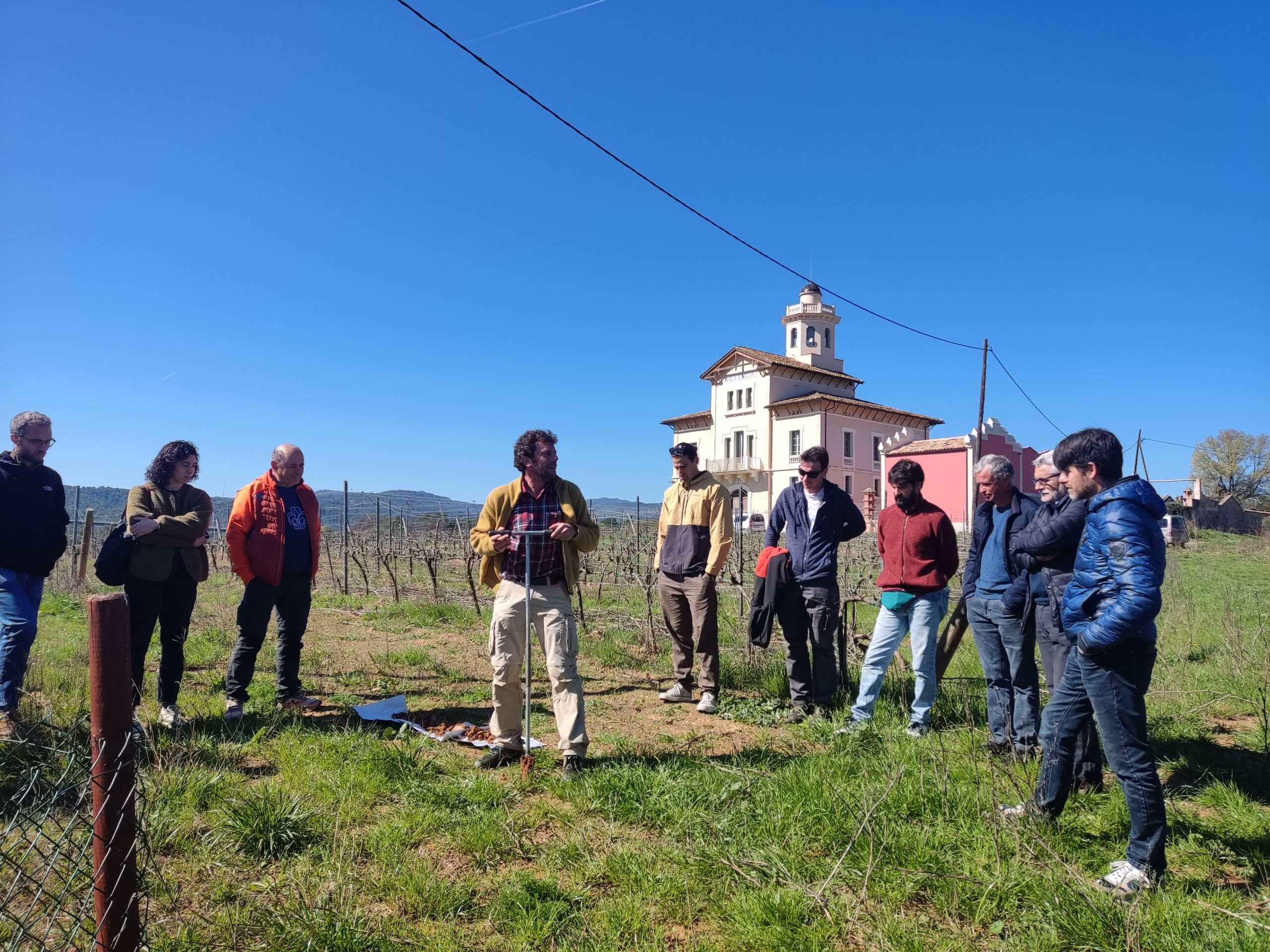 En concret, Miquel Palau ha exposat la seva experiència en l’ús de sensors i tècniques d’encoixinat per optimitzar la retenció d’humitat al sòl; Josep Mª Claret ha compartit pràctiques com el reg enterrat i l’ús de cobertes vegetals temporals; Carles Muray ha explicat l’aplicació del sistema keyline per millorar la gestió de l’aigua; Oriol Garriga ha destacat l’encoixinat permanent, especialment adaptat a les condicions més humides del Moianès; i Jesus Fonts ha presentat el disseny d’una eina específica per generar una mena de cavallons en vinya que permeten reduir l’escolament i afavorir la infiltració de l’aigua entre les fileres de ceps.